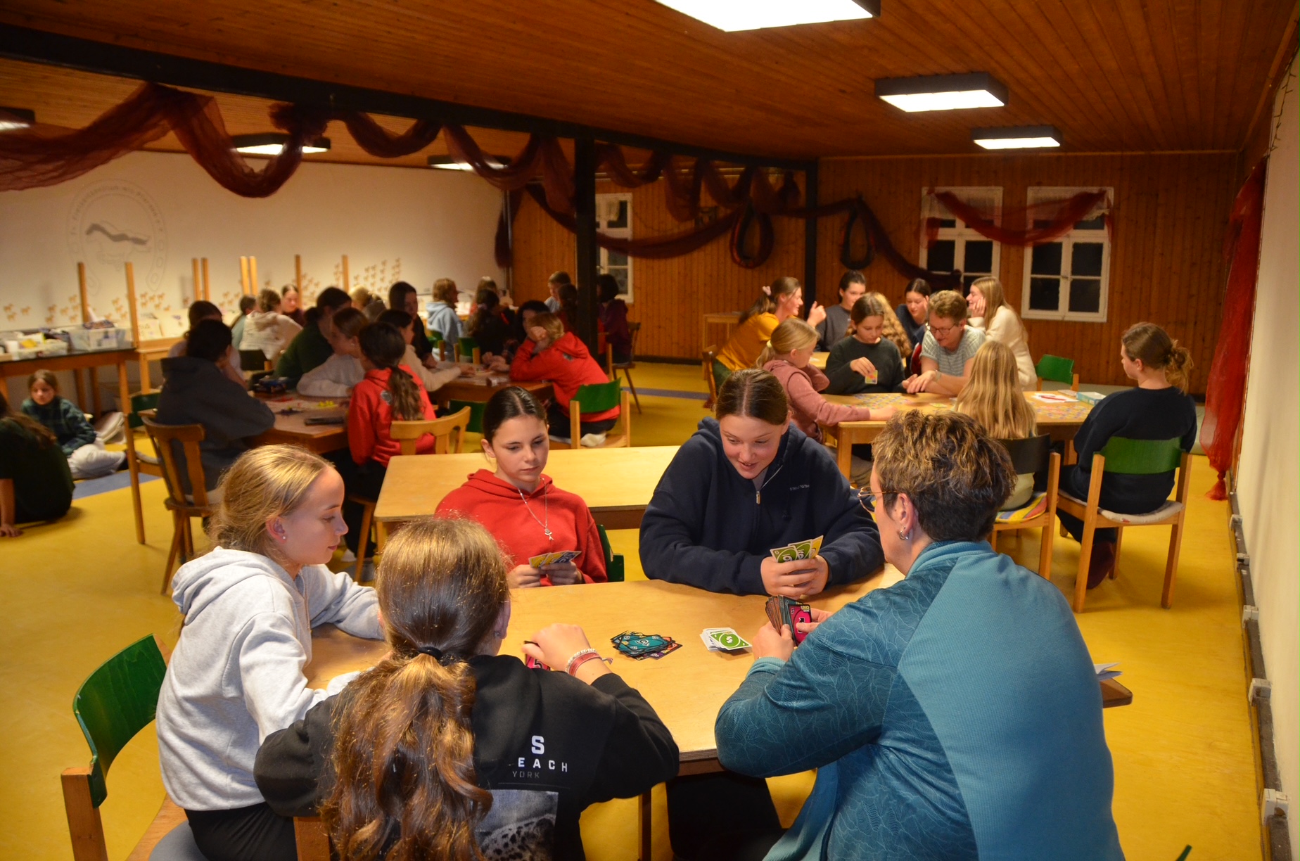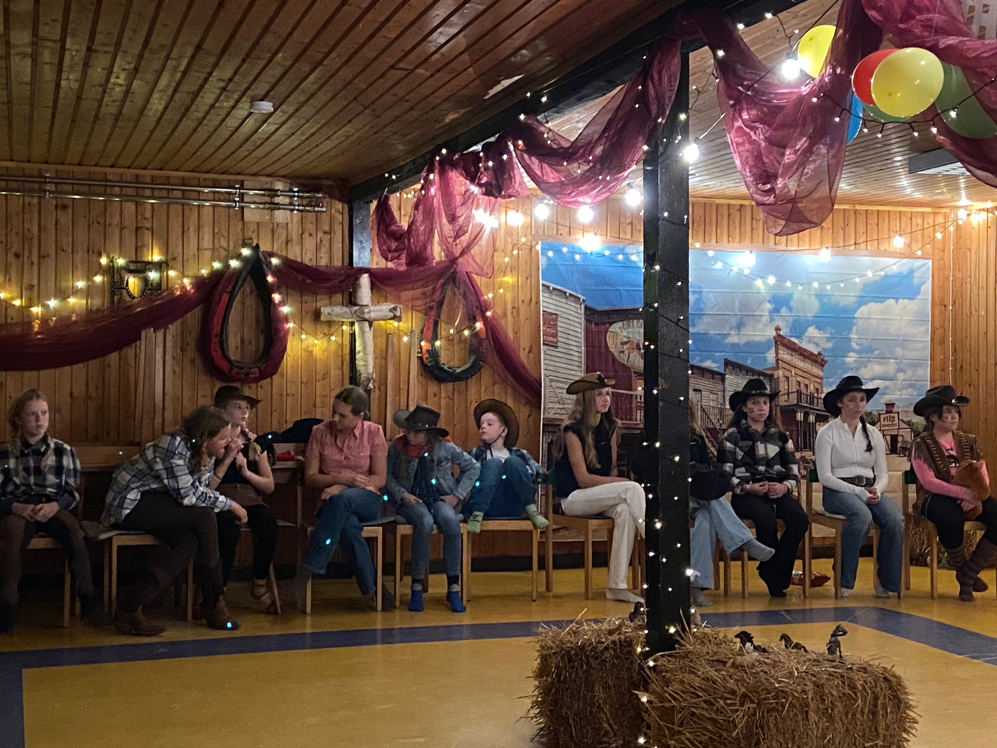 Die Abende waren abwechslungsreich gestaltet mit Spielen, Bastelangeboten, einem Kinoabend, einem Wellnessabend sowie einem bunten Westernabend zum Abschluss. Dazu war der Gruppenraum mit Westernwandbehängen, Strohballen und kleinen Kunststoffpferden zünftig dekoriert. Hier beteiligten sich die Hütten mit kleinen Spielen und Vorführungen. Den fröhlichen Abschluss bildete ein gemeinsamer Line-Dance.